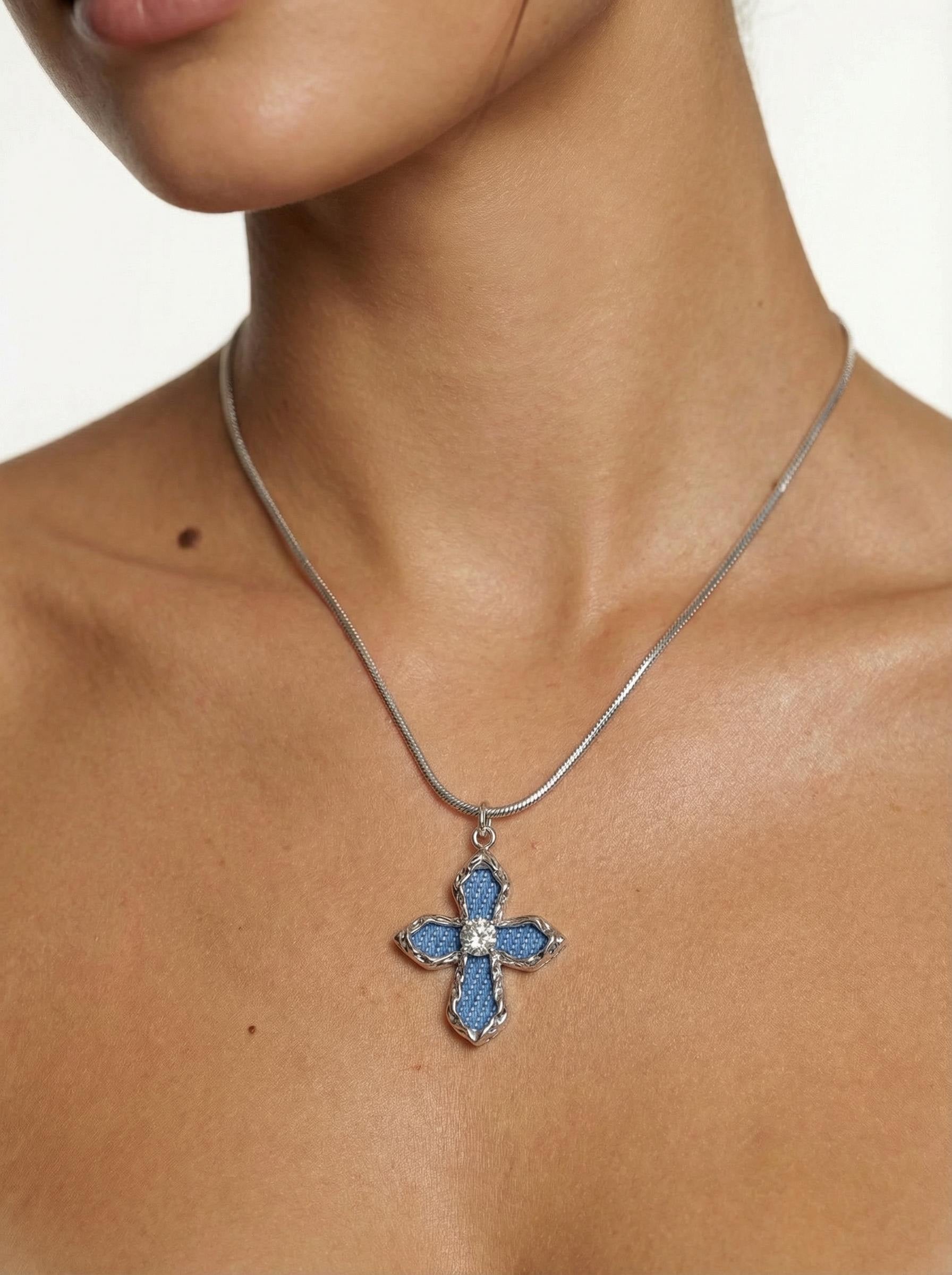 Your favorite denim jacket, miniaturized. Blue textile inlay meets white gold-plated brass in this cross that bridges Sunday spirituality and Saturday streetwear.